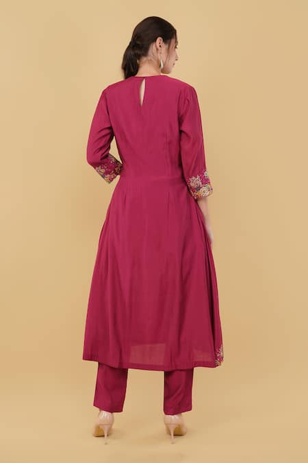 Mouvish pink A-line kurta featuring floral embroidery with zardozi, dori, and knotted handwork. Paired with matching pants for a complete look.