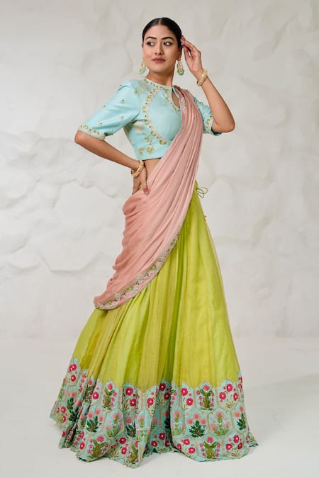 Green lehenga featuring hand embroidered floral border and attached peach draped pallu. Paired with a sky blue padded blouse adorned with hand embroidered floral motifs.