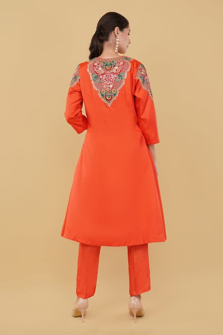 Buy_Nidhi Kejriwal_Orange Silk Embroidery Round Neck Floral Patch Work Kurta With Pant _at_Aza_Fashions