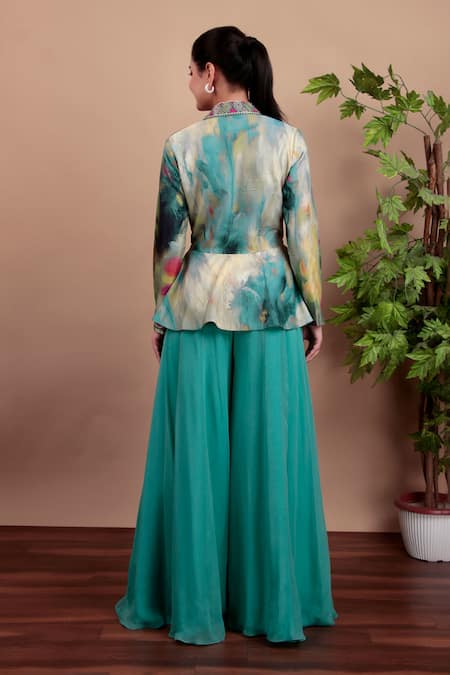 Aqua floral printed peplum top featuring a deep neckline and heavily hand-embroidered collar with intricate bead and sequin work. Paired with flowy teal palazzo pants made from crepe and georgette fabrics.