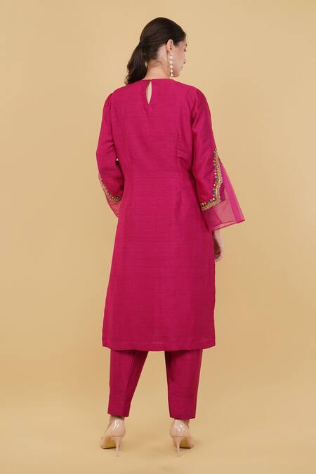 Wine kurta featuring floral patchwork embroidery with thread and dori. Paired with a matching salwar.