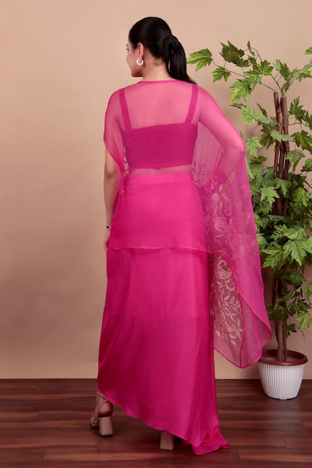 Magenta silk cape featuring intricate embroidery with organza detailing. Accompanied by a matching blouse and dhoti skirt.