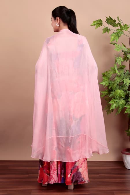 Multicolor floral printed Indo-western set featuring a corset-style blouse and flared drape skirt. Paired with a light pink sheer cape adorned with 3D floral embroidery and sequins along the shoulders and front.