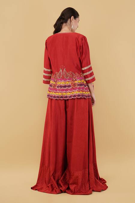 Buy_Nidhi Kejriwal_Red Chanderi, Silk, Denim Sequins, Paisley Embroidered Jacket With Jumpsuit_at_Aza_Fashions