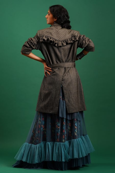 Olive green jacket with floral embroidery and ruffle detail at the back.