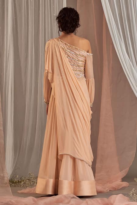 Salmon pink embroidered one shoulder anarkali with attached drape. Paired with an embroidered belt