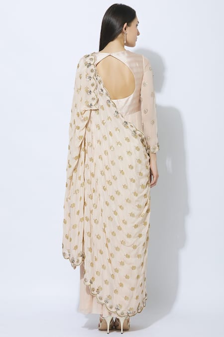 Peach Silk, Georgette, Shantoon Lining Pre-draped Embellished Anarkali