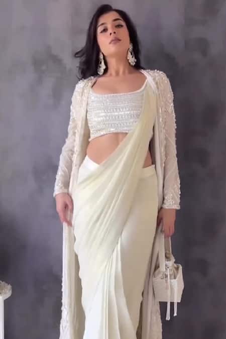 Ivory crepe embroidered cape with sequins, pearls and stones. Comes with foil georgette saree, fully embellished silk padded blouse and embroidered belt with tassel detailing.