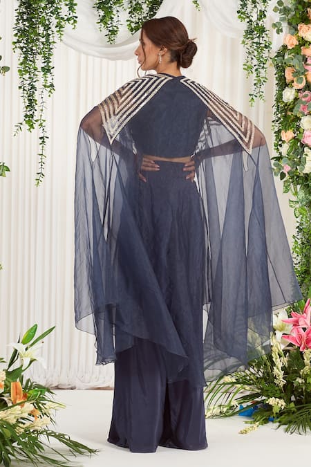 Charcoal grey silk embellished crop top with pearl,stone and sequins embroidery. Paired with embroidered organza cape and palazzo.