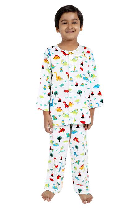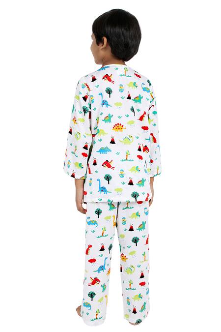 Off white top with dinosaur printed motifs. Paired with printed pant.