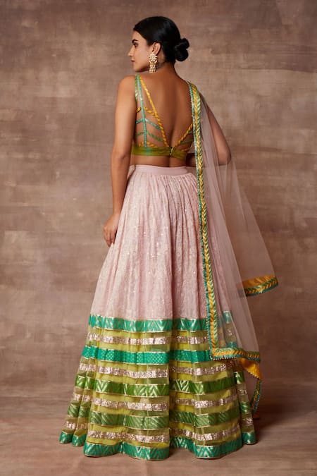 Pale mauve lehenga in white thread work embellished in transparent sequins with sheer lace highlights of green in metallic color embossed patterns. Paired with pistachio cutwork blouse. Comes with tulle dupatta in lace borders.