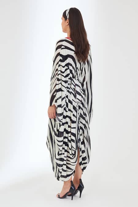 Black and white kaftan dress in 100% viscose georgette featuring an all-over animal print, pleated cowl drapes, and antique brass sequin, mirror embroidery on the V neck