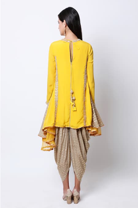 Yellow kurta with side floral printed panel,placement embroidery & gota patti trim detail. Comes with beige dhoti pants.