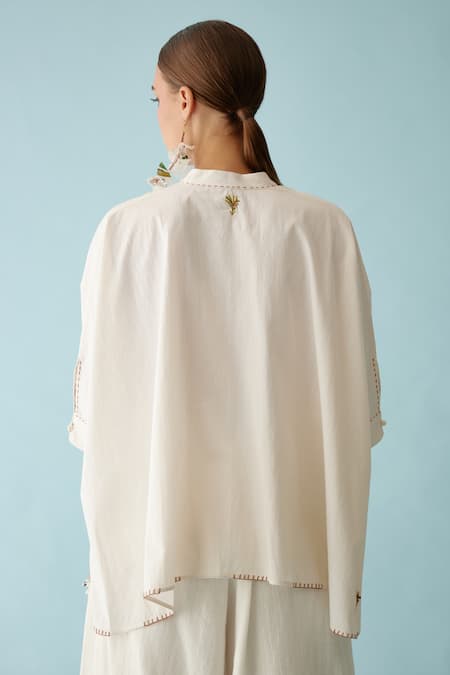 Cream high-low top featuring handwoven jamdani yoke and banana tree applique detailing