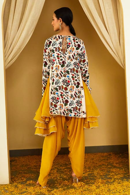 Ivory asymmetric kurta featuring multicolour kohinoor floral print and contrast side godets. Paired with a contrast yellow tulip dhoti pant with gota detail.