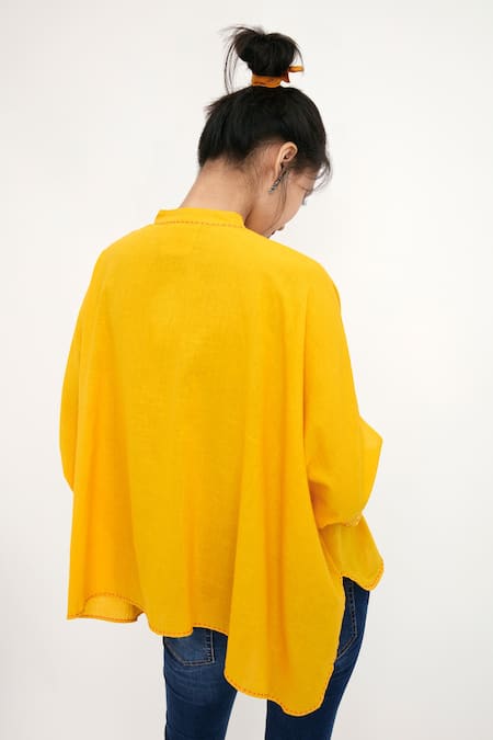 Yellow handwoven top with hand painted chintz motifs, hand embroidered with beads, sequins & French knots.