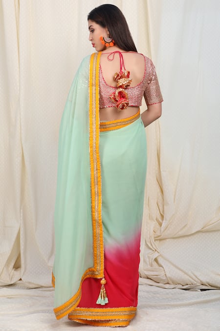 Ombre pista, rose saree with tassel detail on pallu. Paired with embellished blouse.