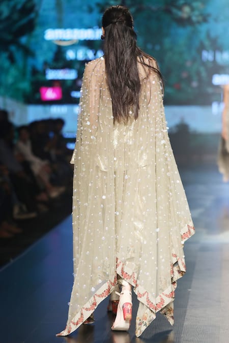 Grey long cape paired with foil print short tunic. Comes with dhoti pants.