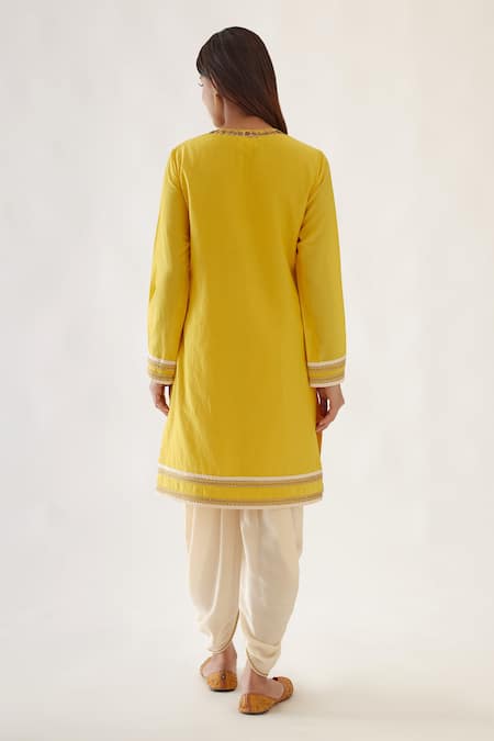 Yellow handwoven cotton silk kurta with thread work on yoke, dabka, cut dana, sequin, gota lace work. Paired with cream crepe dhoti pants & chiffon dupatta with gota lace border.