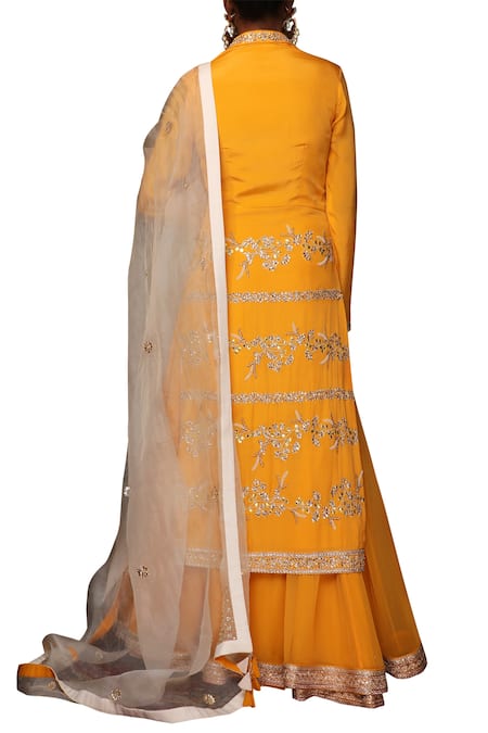 Yellow ochre kurta with floral motif embroidered all over. Paired with lehenga & dupatta.
