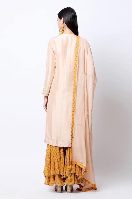 Beige tinted peach kurta with placement sequin & bead work. Comes with embellished dupatta & layered yellow sharara pants.