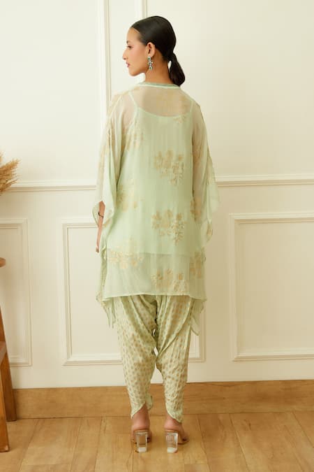Green Viscose, Georgette, Crepe Embroidery, Foil Printing Kaftan With Dhoti Pant