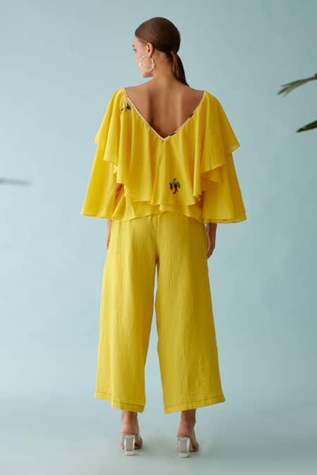 Yellow layered ruffle top featuring hand embroidered chilies appliques with sequin highlights. Paired with matching wide leg pant that includes side pockets.