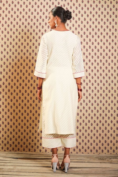 Ivory handwoven banarasi chanderi kurta with sindoori red piping & antique coin hand embroidered neckline. Paired with pant & sindoori red handwoven kota doria dupatta.