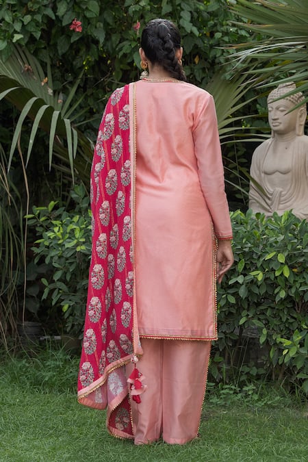 Pyazi kurta with lace trim detail. Paired with Chanderi pant & printed dupatta.