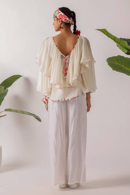 Ivory Cotton Embroidery V-neck Ruffle Top With Ribbon