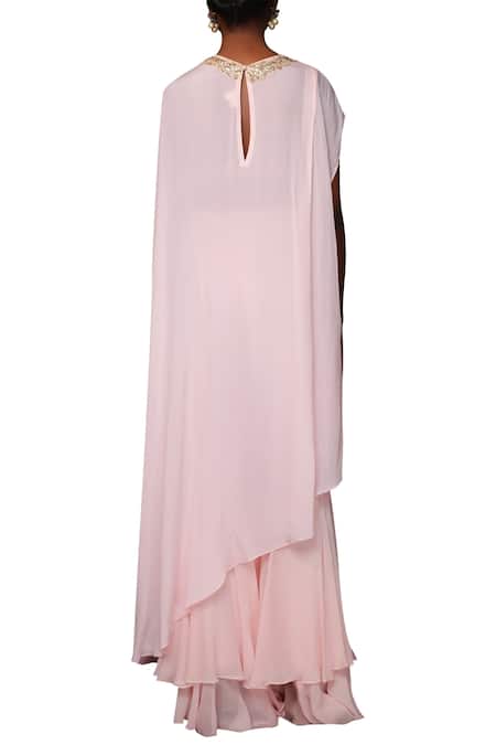 Pastel pink kaftan style placement embroidered tunic. Comes with matching layered sharara.