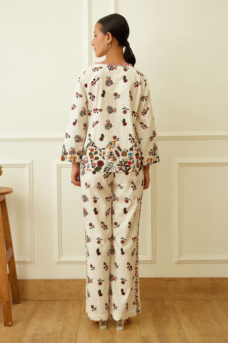 Ivory Cotton Beads, Embroidery Split V-neck Kohinoor Buta Print Top With Pant