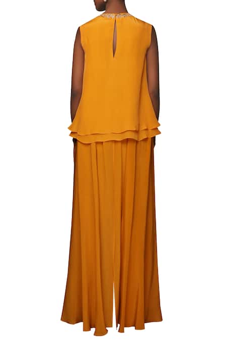 Yellow Crepe Round Neck Layered Top With Flared Pants
