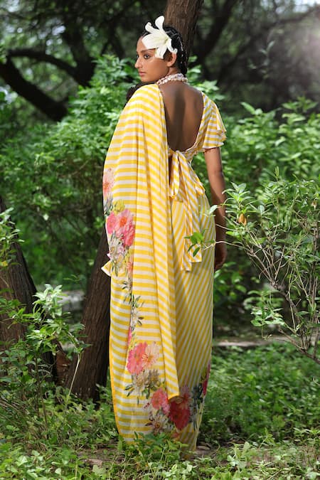 Pitambari yellow-white lehariya saree with printed motifs. Comes with blouse.