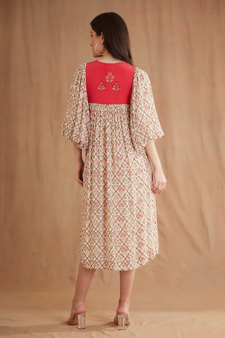 Red Viscose Embroidery Keyhole Neck Mughal And Floral Print Dress