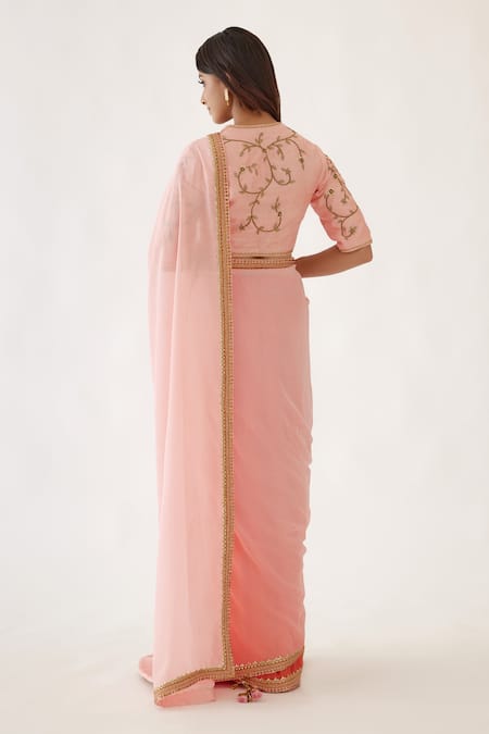Peach & orange ombre saree with coin embroidery & gota lace border. Paired with dabka, sequin embroidered blouse.