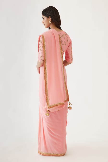 Pink & gajjari ombre saree with coin embroidery & gota lace border. Paired with dabka, sequin embroidered blouse.