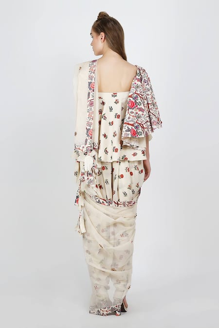 Ivory one shoulder top with all-over floral motifs. Paired with dhoti pant and kota doria dupatta.
