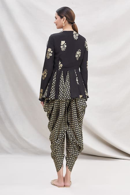 Black angarkha peplum short kurta with all-over floral motif work. Comes with dhoti pants.