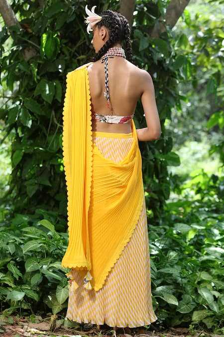 Buy_Nikasha_Yellow Georgette V Neck Pre-draped Saree With Sleeveless Blouse _at_Aza_Fashions