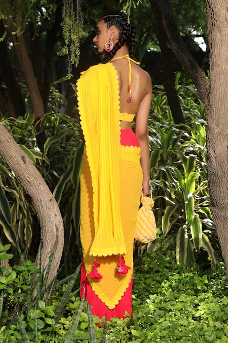 Gajjari coral pre-draped colorblock saree with yellow pleated palla, floral applique on shoulder and scalloping detail border. Paired with yellow unstitched blouse fabric.