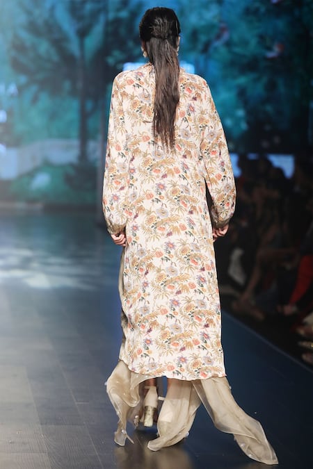 Grey Organza, Crepe Floral Motifs Round Printed Asymmetrical Kurta With Skirt
