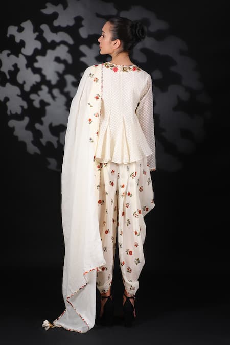 Off white handwoven cotton jamdani panelled top with hand-embroidered neckline. Paired with hand-painted chintz print dhoti pant & dupatta with chintz scallop border.