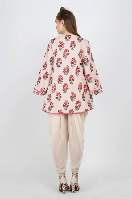 Beige short kurta with all-over floral print and round neck. Paired with dhoti pants.