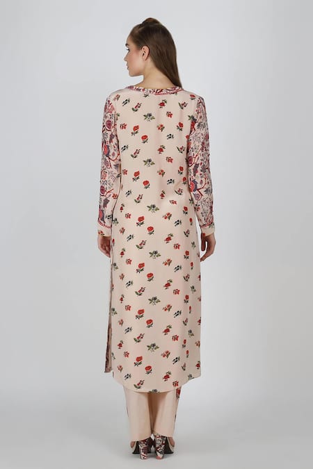 Beige straight kurta with all-over floral print and V-neck. Paired with straight pants.