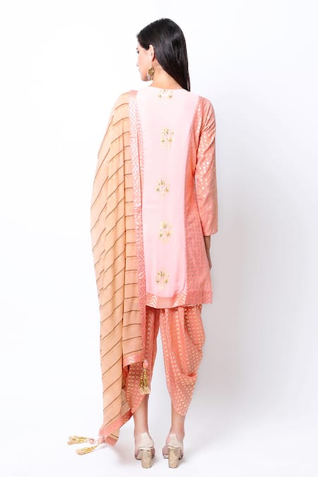 Pink straight kurta with placement floral motif print & embroidery. Comes with leheriya dupatta & dhoti pants.