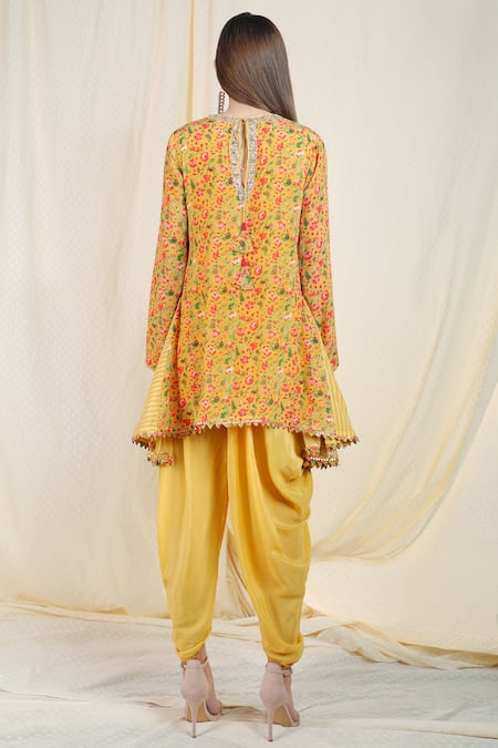 Buy_Nikasha_Yellow Crepe Round Printed Kurta Dhoti Pant Set _at_Aza_Fashions