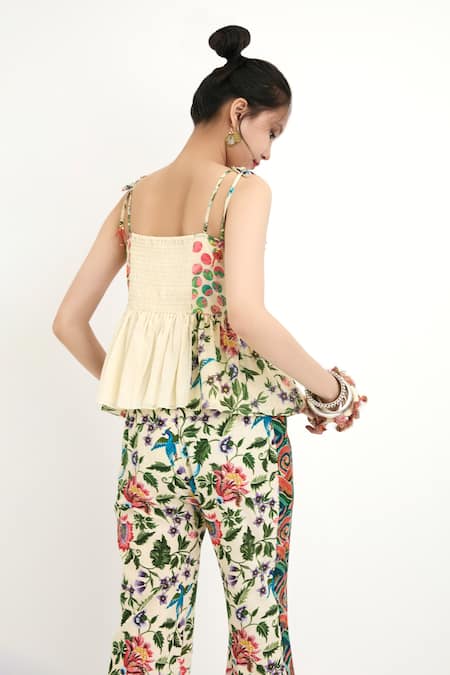 Shoulder tie-up straps, Multi motif prints, Side pleats, Note:The pant worn by the model is not for sale