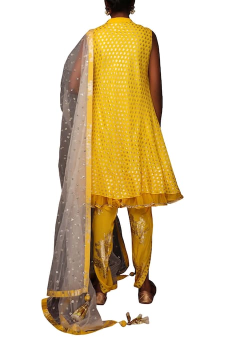 Yellow hued all over print & placement floral motif work tunic paired with matching dhoti pants & contrast dupatta.