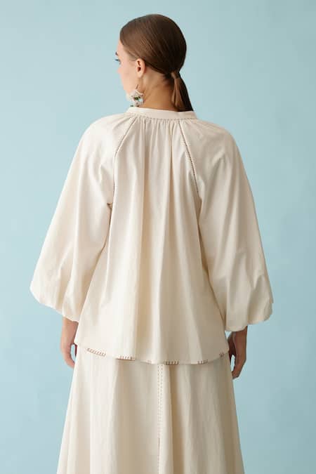 Cream Poplin Embroidery Collared Raglan Sleeve Shirt